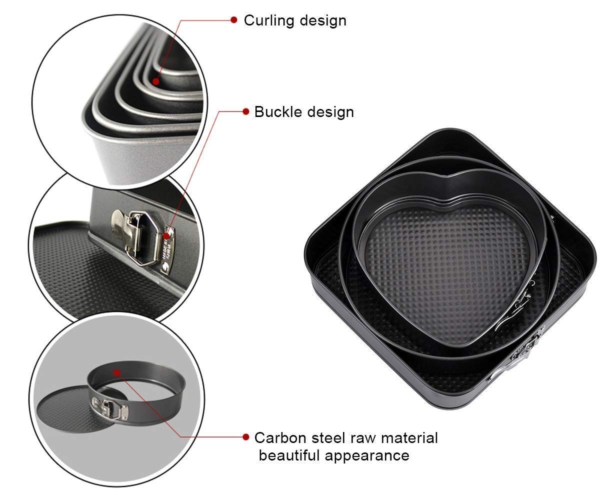 - This cake baking pan set that comes with 3 piece non-stick cake pans in different shapes (heart shape, round shape, square shape), which allows your make different shaped cakes as you need. Ideal for all types of cakes, such as pies, cheesecake, desserts, ice cream cake and so on.
